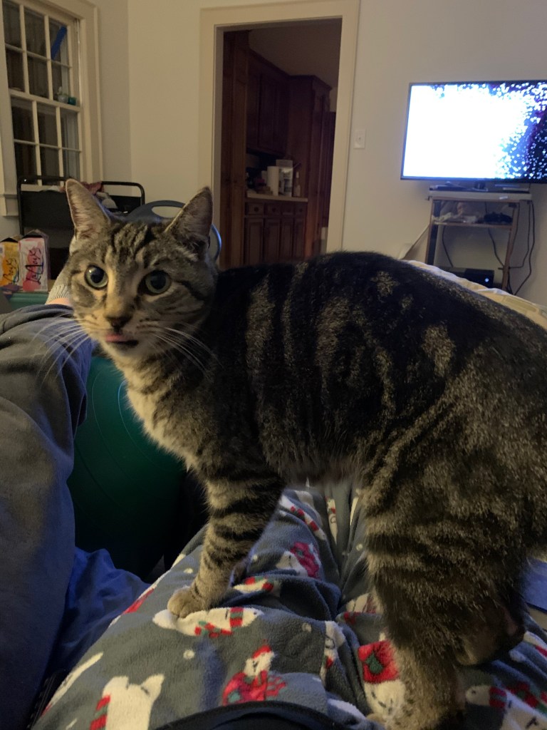 In the days leading up to our interview, Jennifer and I did a lot of the typical “getting to know you” activities: a little sightseeing, sampling the local cuisine (North Carolina barbecue!!), talking about our lives in general, and sharing plenty of Randy-related anecdotes. The true bonding between all three of us, however, would happen after hours, when we’d sit around in the evening, dorm-room style, and decompress on her tiny loveseat with YouTube videos. Jennifer introduced me to her favorite kitten live streams, while I taught her the ways of Robot Chicken Star Wars. Jasper, meanwhile, was showing signs that, maybe, he was beginning to accept this strange newcomer. From darting past us to the kitchen, and then back again to hide upstairs, he would venture over to curl up on Jennifer’s lap for a while before finally, tentatively, spreading himself across my knees.