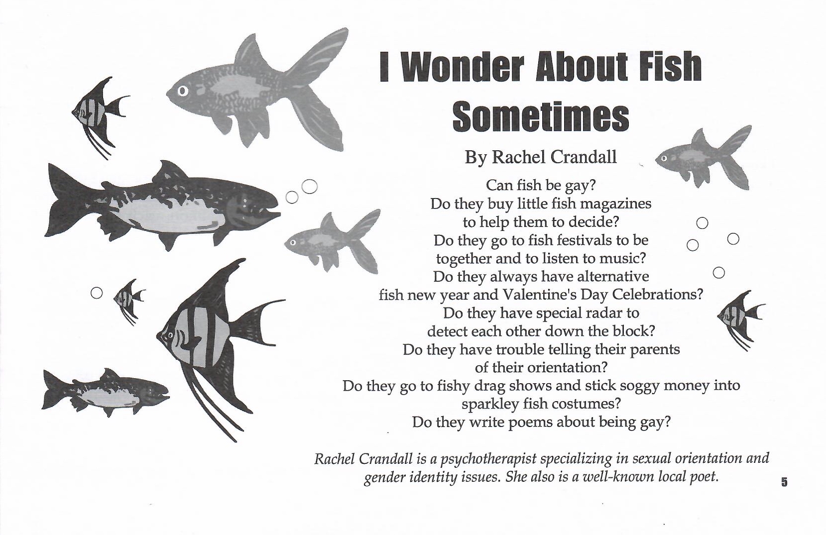 Of all the ways we formed a bond during those years, Rachel and I shared a love of writing poetry, especially stream-of-consciousness pieces that made space for exploring different facets of queer identity. It’s no surprise to me, then, that her first submission to the Q-News was a brief poem asking the question, “Can fish be gay?” When I showed her this piece during our call, she exclaimed, “Oh wow! I don’t remember what I was thinking. However, it’s really cute!”