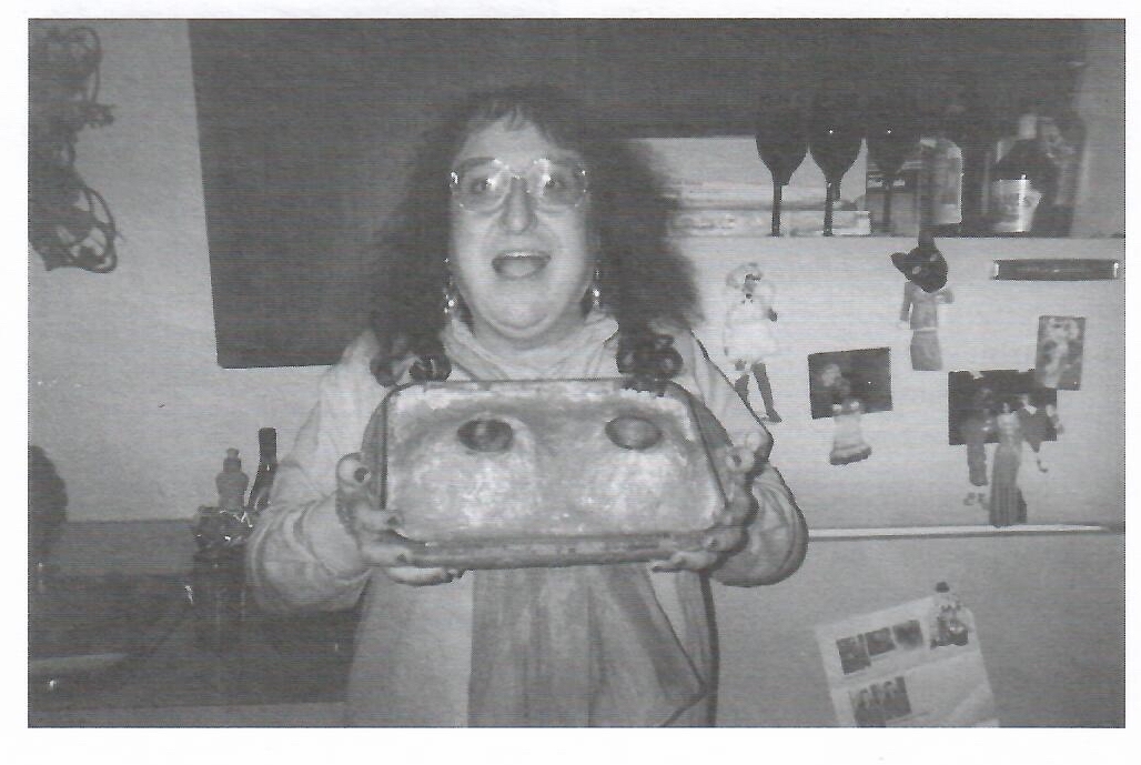 Rachel’s brief submission, however, is memorable to me because it provoked the only complaint that I ever received as editor of the Q-News. When Rachel gave me the story, she included a photo from a recent party, showing her playfully holding a pan of baked mashed potatoes, shaped like breasts with melted cheese for nipples. Not long after its publication, I received an email from a cisgender gay student, complaining that the photo was offensive in how it depicted Rachel. “Straight people judge us by our media, too,” the student wrote.