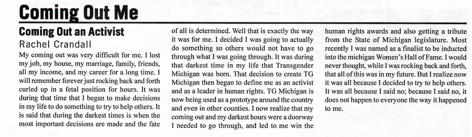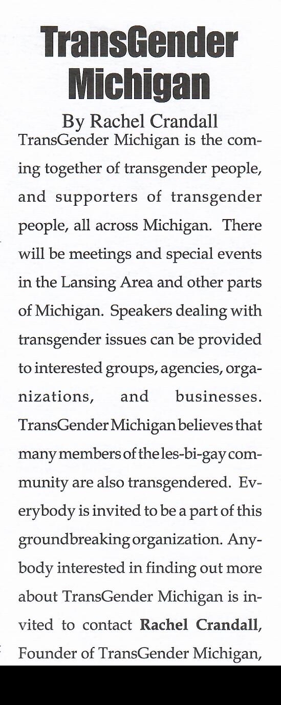 TransGender Michigan is the coming together of transgender people, and supporters of transgender people, all across Michigan. There will be meetings and special events in the Lansing Area and other parts of Michigan. Speakers dealing with transgender issues can be provided to interested groups, agencies, organizations, and businesses. TransGender Michigan believes that many members of the les-bi-gay community are also transgendered. Everybody is invited to be a part of this groundbreaking organization. Anybody interested in finding out more about TransGender Michigan is invited to contact Rachel Crandall, Founder of TransGender Michigan, [redacted contact information].](https://authormglee.com/wp-content/uploads/2023/03/08.1998-tg-michigan-redacted.jpeg?w=120)