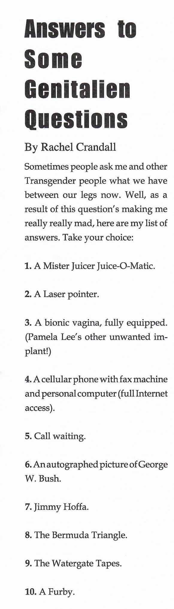 There were two more Q-News pieces I shared with Rachel during our call. The first came from my final issue as the editor, which we devoted to anger and outrage. The idea had been to give community members a space to vent about whatever was pissing them off, and Rachel at the time had plenty to say. Her first piece was a “Top Ten” list, sarcastically answering the question she most frequently got from strangers in public: “What do you have between your legs?”