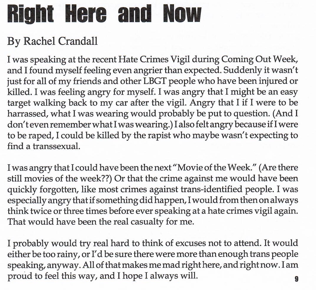 On reflection, I shouldn’t have been surprised. As she related it both in print and in our call, Rachel’s motivation to advocate for Transgender visibility had taken a dramatic leap forward following an especially harrowing event. “I received a phone call one recent morning. It was a paramedic who had just admitted to a local hospital a [Transgender] woman who had tried to kill herself. The paramedic believed that this woman needed an advocate with her in the hospital, and nobody there knew of anyone but me. This person had no support and desperately needed someone right then, right there.”